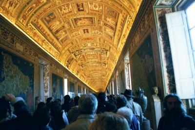 We began our tour in the Courtyard of the Pine Cone (photo above). All of the buildings that today make up the museums were at one time or another the apartments of the popes. Today, the museums of the Vatican comprise one of the most valuable collections of art in the entire world. We toured a number of rooms and hallways and saw many wonderful masterpieces. However, I captured very few photographs. The photo below was of the ceiling of a very long hallway. Our guide pointed out that even though the art work on the ceiling appeared to show at least several inches of relief, it was actually, a totally flat painting. The other photograph is of the beautiful "Sphere within Sphere" by Arnaldo Pomodoro commissioned by the Vatican in 1990.