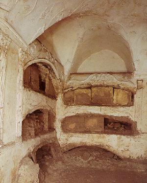 Catacombs means "near the ravine". The name dates back to the ninth century A.D. and refers to the underground burial places of the first Christians which is near the Appian Way, just outside of Rome. In most areas, there are five levels of graves one on top of another and each, carved out of the rock. Recent discoveries indicate that in some places there are as many as twelve levels. Many of the early popes and Christian martyrs were buried in this area.
