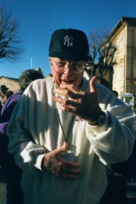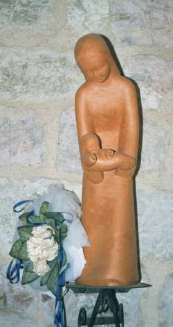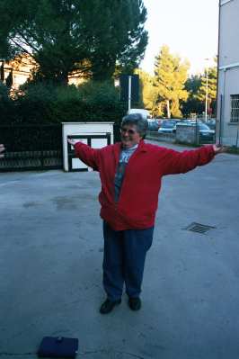On Tuesday morning we boarded the bus for a 2 1/2 hour drive north of Rome to Assissi. The drive was beautiful. In the distance off to the east, we could see a beautiful range of snow capped mountains. On either side of the Autobahn we got a chance to view the beautiful green countryside of the "back of the boot". Also, during the bus ride Linda Clancy led a rosary for the entire group. As you can see from the photo at the top of this page, the city of Assissi is divided between the ancient city on the top of the hill and what they referred to as lower Assissi next to the highway. The church on the top of the hill is the Basilica of St. Francis. The church in the foreground is the Basilica of Santa Maria degli Angeli
